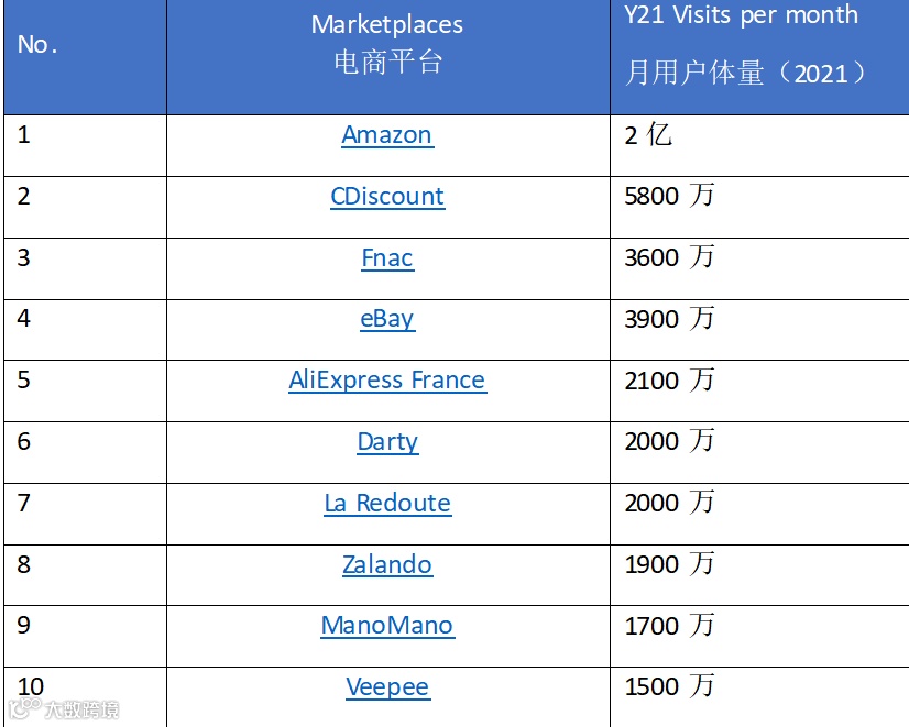 法国主流电商平台月度用户体量: