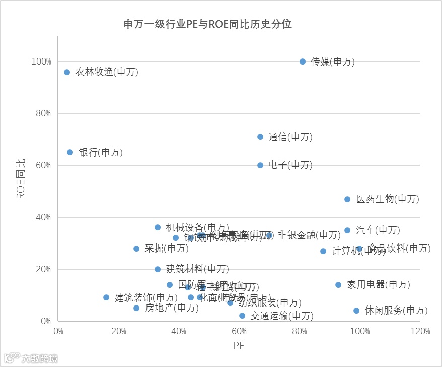 行业PE与ROE同比在2015年以来历史分位对比分析,农林牧渔、银行、采掘、传媒以及通信等行业在相同历史估值分位下ROE增速处于历史高位。