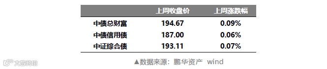 上周各债市指数小幅上行,中债总财富上涨0.09%,中债信用债上涨0.06%,中证综合债上涨0.07%。
