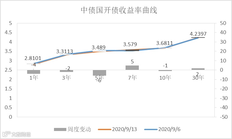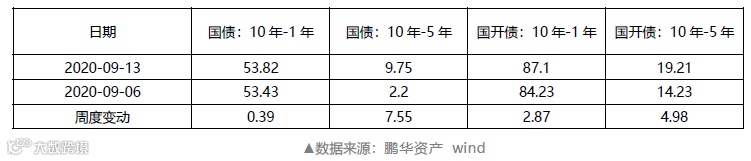 上周国债、国开债收益率期限10-1Y、 10-5Y期利差均走阔。