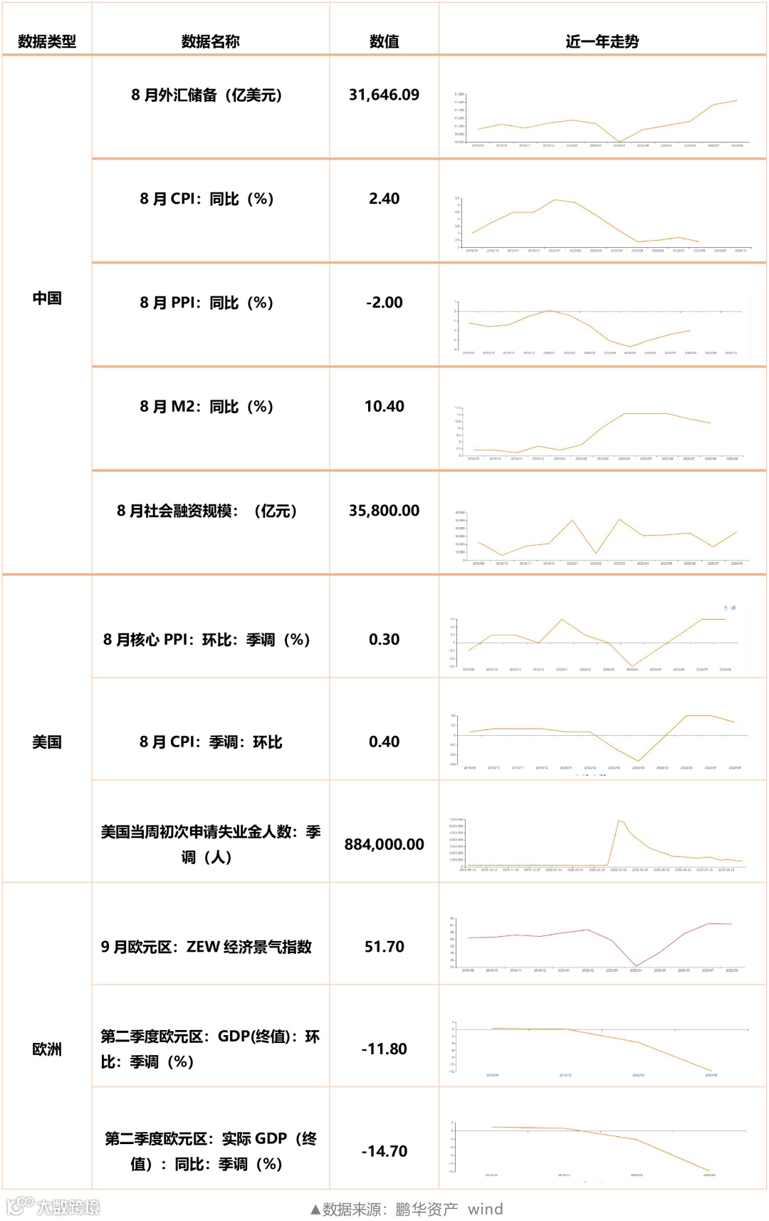 (4)欧洲央行:9月10日,欧洲央行行长拉加德出席新闻发布会,预测2020年欧元区实际国内生产总值(GDP)将萎缩8%,通货膨胀率为0.3%。