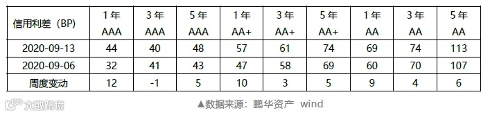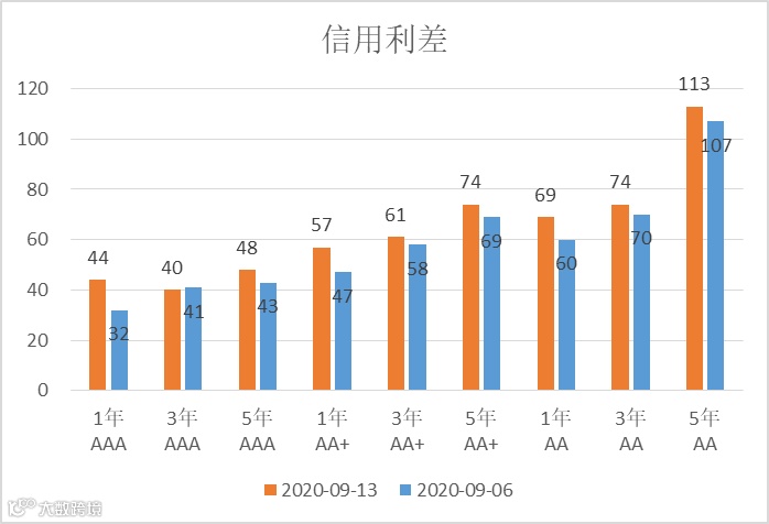 上周各等级信用债利差整体走阔。