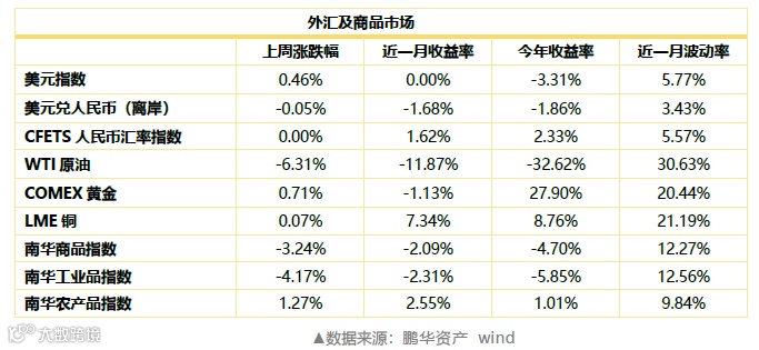 上周美债期限利差小幅收紧,处于低位54-56BP附近;中美10年期国债利差仍处于历史高位,收报246BP。
