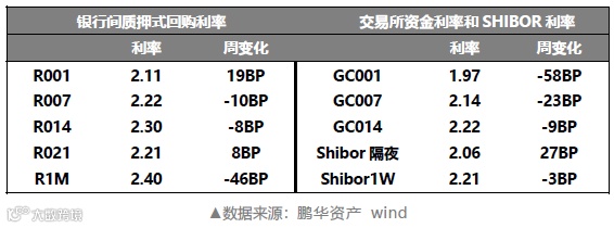 上周月初资金面边际宽松,银行间交易所回购利率涨跌互现。R001加权收报2.11%,R007加权收报2.22%;GC001收报1.97%,GC007收报2.14%。