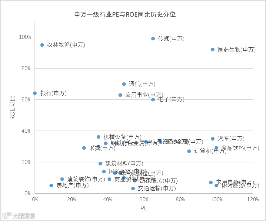 行业PE与ROE同比在2015年以来历史分位对比分析,银行、农林牧渔、通信、采掘以及传媒等行业在相同历史估值分位下ROE增速处于历史高位。