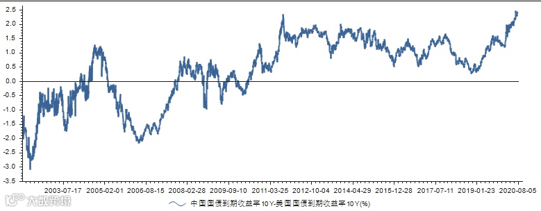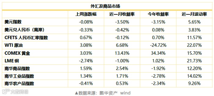 上周美债期限利差保持历史低位46BP附近;中美10年期国债利差扩张至历史高点,上周收报242BP。