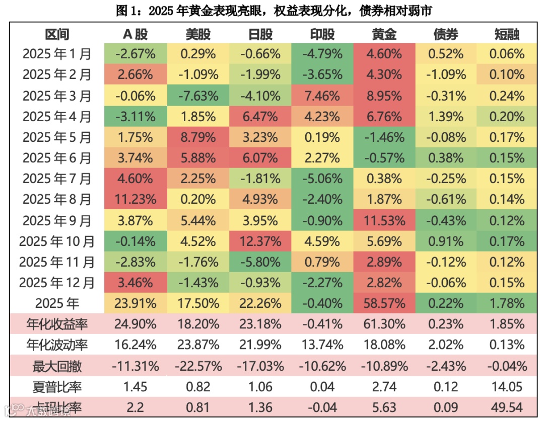 数据来源:Wind、东方证券研究所,2025.1.1-2025.12.31,跨境资产均经汇率调整,以人民币计价。其中:A股-中证800(H00906.CSI),美股-纳指100(NDX.GI),日股-日经225(N225.GI),印股-孟买30(SENSEX.BO),黄金-SGE黄金9999(Au9999.SGE),债券-政金债7-10财富(CBA08201.CS),短融-短融债(H11014.CSI)。区间收益率(年化)=[(1+区间收益率)^(250/交易日天数)-1]*100%,年化波动率={∑[(Ri-∑Ri / N)^2] / (N-1)}^0.5*250^0.5,最大回撤=Min{(Xi-Xj)/Xj)*100%},Sharpe(年化)=(年化后的平均收益率-无风险收益率) / 年化后的波动率,Calmar比率=统计区间年化收益率/abs(统计区间最大回撤)。指数过往不预示未来表现。