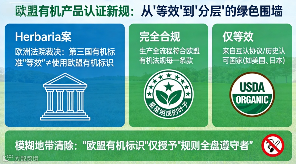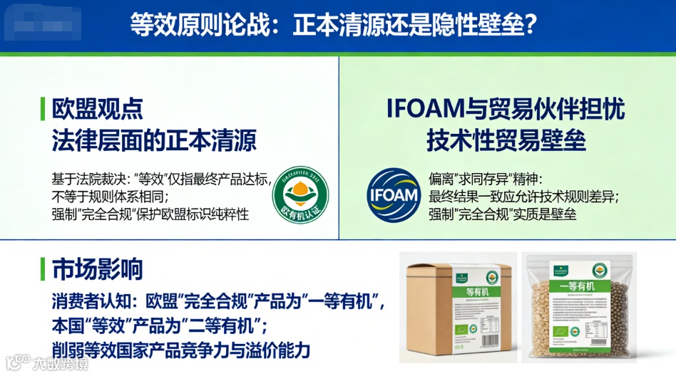 欧盟的逻辑(基于法院裁决):“等效”只意味着最终产品达到了类似的有机标准和要求,但不等于两套规则体系完全相同。因此,只有完全按照欧盟自家“食谱”生产的产品,才配得上欧盟的“商标”。这被视为法律层面的“正本清源”,旨在杜绝混淆,保护欧盟标识的纯粹性和公信力。