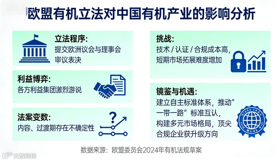 挑战:中国有机产品若想以“完全合规”身份进入欧盟,将面临极高的技术、认证和合规成本。短期内,市场拓展难度可能增加。