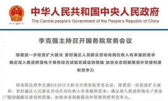 李克强总理主持召开国务院常务会议,会议指出,发展跨境电商,推动国际贸易自由化、便利化和业态创新,有利于转变外贸发展方式、增强综合竞争力。要求新建跨境电商综合试验区,将跨境电商监管过渡期政策延长至2018年底。加强物流网络等配套服务体系建设。(9月21日)