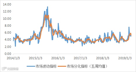 上周个股间分化处于高位,全周下来个股间分化指标仍处在高位。
