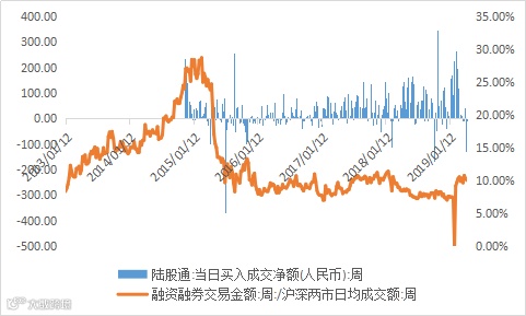 上周融资融券余额继续上升,融资交易额占比提略降。陆港通北向资金小幅流出,全周流出额7亿元,近一个月以来陆股通累计流出超过百亿元。