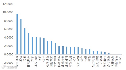 上周除房地产、农林牧渔等少数板块外,其余板块均上涨,家电、通信、采掘等板块大涨。
