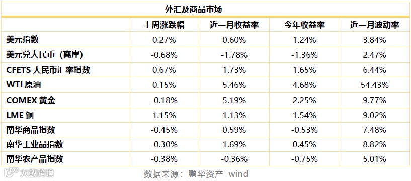 商品市场。国际原油经过大起大落后趋于稳定,上周国际油价小幅震荡,国际铜价走高,黄金价格回落。国内商品小幅走弱。能化品种调整幅度较大,有色、黑色系小幅上涨,工业品表现震荡。农产品小幅下跌,南华农产品指数下跌0.38%,贵金属指数小幅震荡。总的来看近段时间工业品经历上涨后小幅调整,前期涨势农产品陷入调整。市场波动率回落。