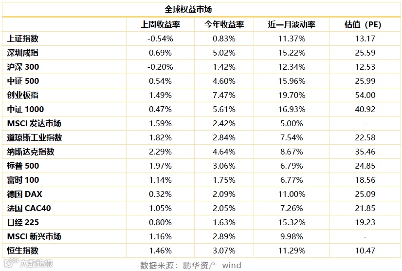 股票市场。上周A股震荡调整,市场分化。上证指数下跌0.54%,但中小创延续涨势,中证500上涨0.54%,创业板指上涨1.49%。计算机、电子、医药生物等成长板块延续涨势,休闲服务、银行、交通运输则表现较弱。两市成交额回落至5500亿。陆股通保持流入,全周流入近200亿,两融余额小幅上升,融资成交占比升至近一年来新高。在经济数据边际改善及中美贸易谈判取得阶段性成果情况下,同时货币政策灵活适度,A股迎来较为友好的窗口期。