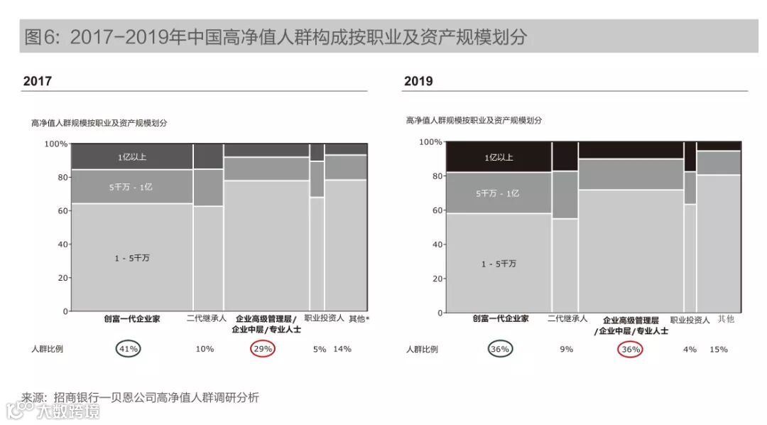 调研数据显示,2019年企业高级管理层、企业中层及专业人士占全部高净值人群的比例由2017年的29%上升为36%,首次与创富一代企业家群体看齐。二代继承人、职业投资人占全部高净值人群的比例均较2017年有所下降,分别为9%和4%。