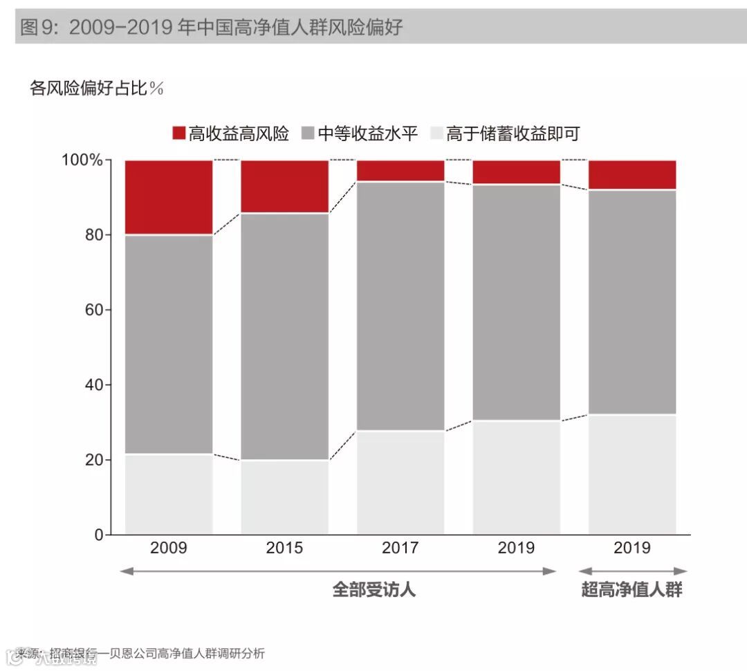 在中国财富市场增速放缓与过去两年市场波动的背景下,2019年高净值人群避险情绪加强。从投资收益率预期上看,与2017年相比,高净值人群意识到获得与过去两年同等收益率的困难不断增加,对收益率预期进一步降低:倾向于“高于储蓄收益即可”的人士占比进一步增加至30%,为过去十年的最高值。