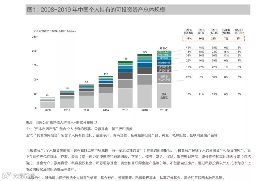 报告显示,2018年中国私人财富市场受宏观经济形势影响,增速相应放缓。2018年,中国个人持有的可投资资产总体规模达190万亿元人民币,2016-2018年年均复合增长率为7%,为2008年来首次出现个位数增长。预计到2019年底,可投资资产总规模将首次突破200万亿大关。
