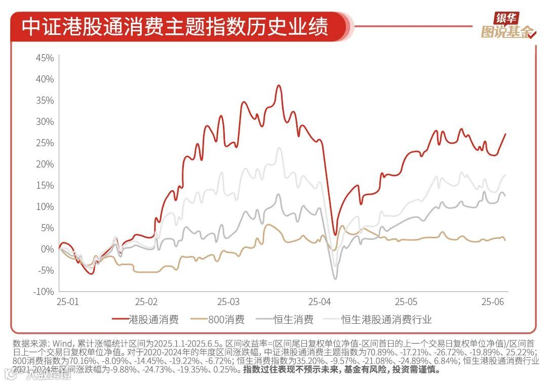 4、受益于新消费及科技行业的崛起,中证港股通消费主题指数今年以来累计涨幅为24.66%,在消费类指数中表现较为突出。