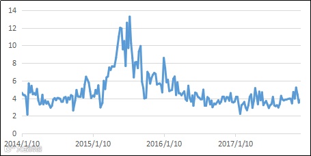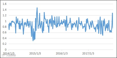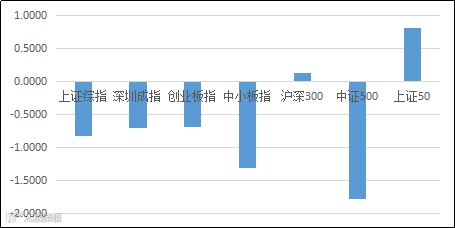 A股续跌。上周A股延续前面的调整局面,上证综指下跌0.83%。权重股表现较强,成长、周期股表现较弱。上证50上涨0.81%,沪深300微涨,中证500下跌近1.8%,创业板指下跌0.7%。市场成交量继续萎缩,中证全指日均成交额降至3600亿以下。两融余额继续维持在万亿以上,沪港通北向资金流出。指数日内波动率保持高位。
