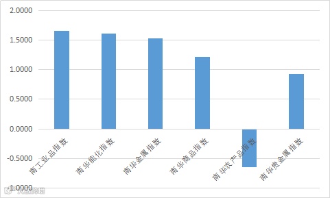 上周美元指数继续回落,国际原油、铜等工业品价格大幅上涨。国内商品亦上涨,南华商品指数上涨1.44%。南华工业品指数上涨超过1.6%。但农产品大多走弱,南华农产品指数下跌0.65%。国内黄金、白银等贵金属反弹,南华贵金属指数上涨近1%。