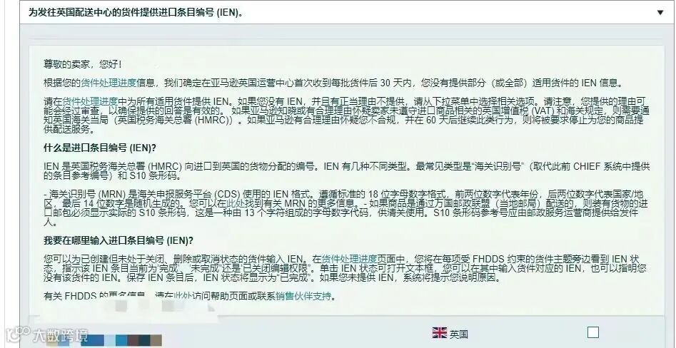 亚马逊英国站要求发往英国配送中心的货件需要提供进口条目编号(IEN)。