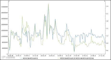 从全市场成交及持仓情况来看,期货市场成交量继续下降,持仓量保持稳定,成交持仓比有所降低。