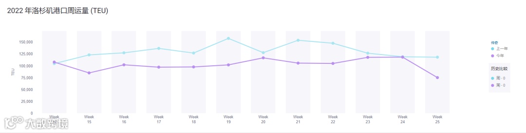 2022年、2021年洛杉矶港口周运量对比(TEU)