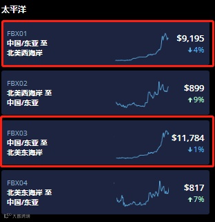 据波罗的海航运交易所发布的FBX指数显示,中国/东亚至北美西海岸海运价格为9195美元/FEU,较上期下降4%,中国/东亚至北美东海岸为11784美元/FEU,较上期下降1%。