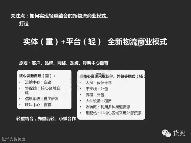 未来的物流一定是平台加金融,为什么加金融呢?举个例子,顺丰这个企业今天什么都做,银行也做,门店也做,这个老板太厉害了,他看到很多未来的东西,大家都在问那个嘿客怎么回事,这是买未来,他知道未来不抢占末端是不行的。最近有一个蜂巢的公司,最初最早做快递柜的是顺丰,但是思想很封闭,不拍照,不宣传,做了几年,差一点被一个企业收购了,突然大家跟他说你要用平台思维,就是你再搞个快递柜是谁都可以往里放的,不能再自己玩了。有人问我这个快递柜的盈利模式在什么?京东现在最赚钱的是到付,顺丰现在最大的竞争对手不是四通一达,它最怕的是京东,因为京东垄断了代收货款,它的服务很好,我家的小区是旧小区,现在所有的快递我经常做测试,还上楼的只有京东和顺丰,当他们上楼的时候消费者就愿意使用他,因为安全、有信心,所以更多的钱就在那里。未来的快递柜到付可以实现,这该会有一个多大的现金流。