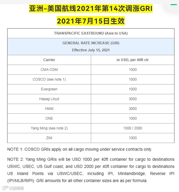 亚洲-美国航线2021年第14次调涨GRI,2021年7月15日生效。