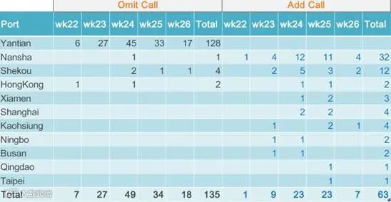 在第22周到第26周(2021/5/23~2021/6/26)亚洲到北美的航线,跳港总数达到135次,加靠63次。