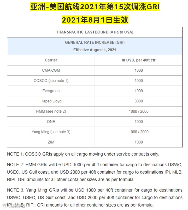亚洲-美国航线2021年第15次调涨GRI,2021年8月1日生效。