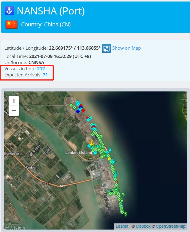 南沙港、蛇口港作为盐田的“后备港”,南沙被加靠了32次,蛇口被加靠了12次。马士基网站上的数据显示,蛇口港的堆场密度为100%,南沙为78%,泊位等待时间为3~4天。