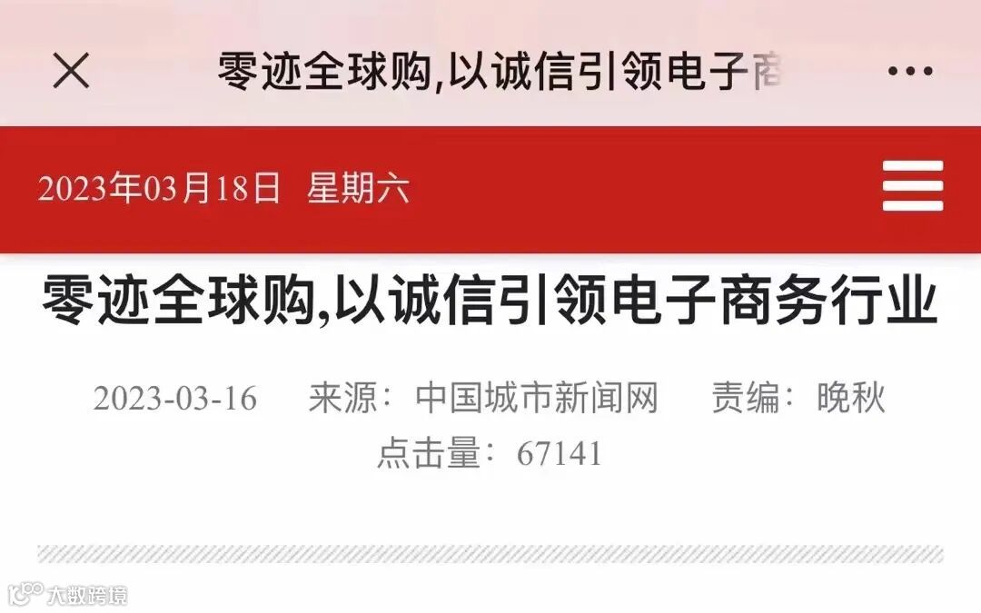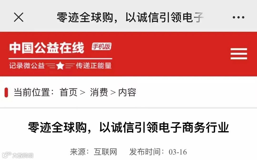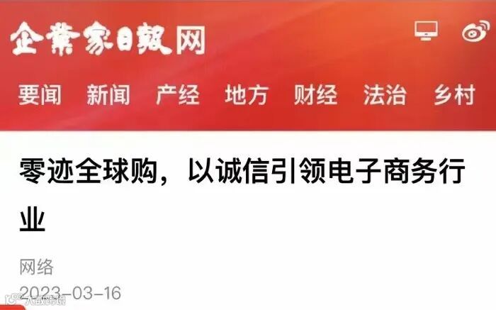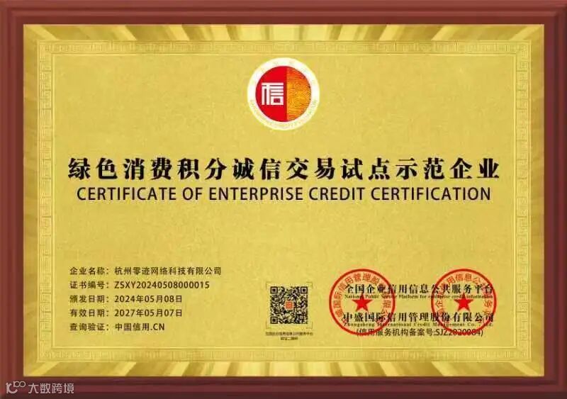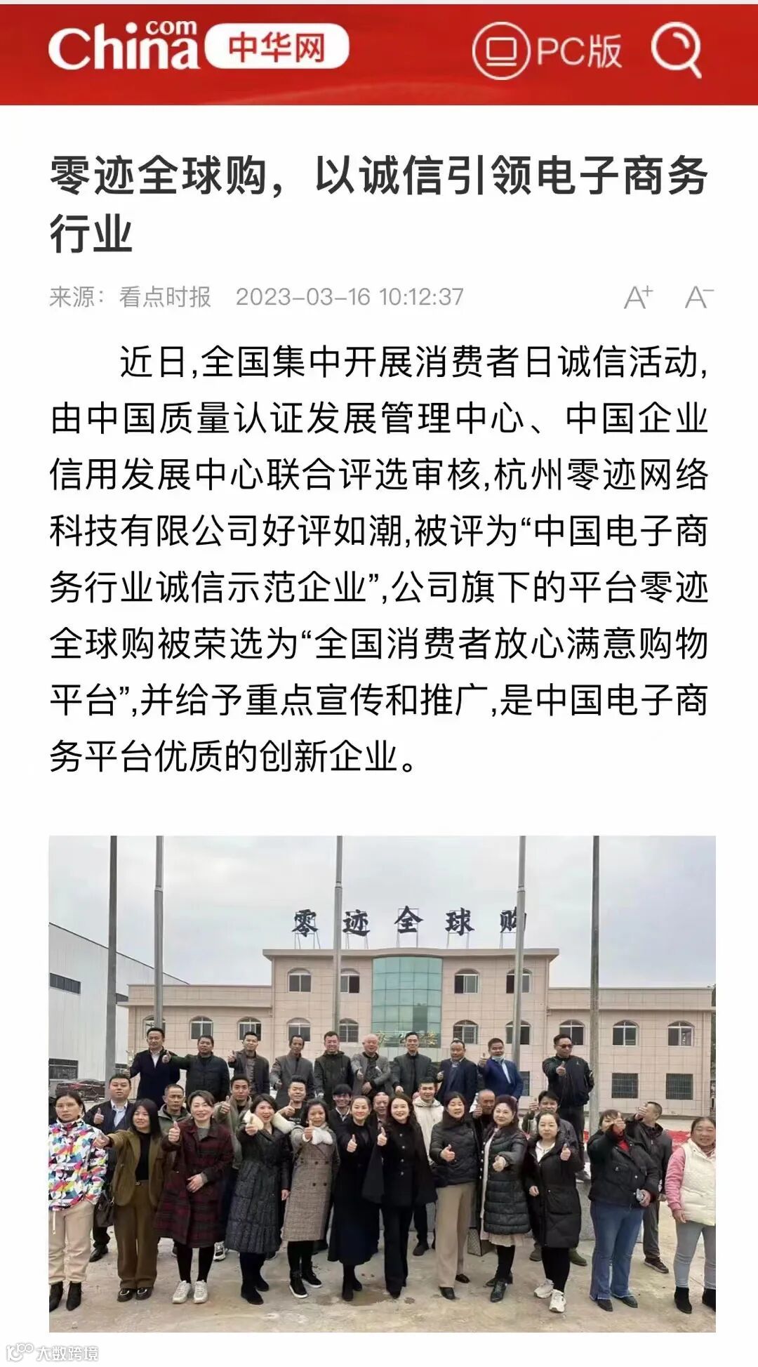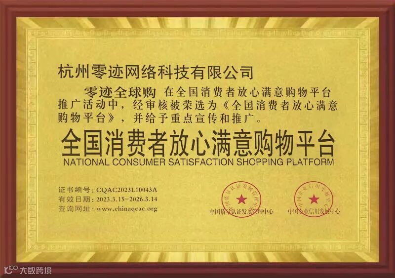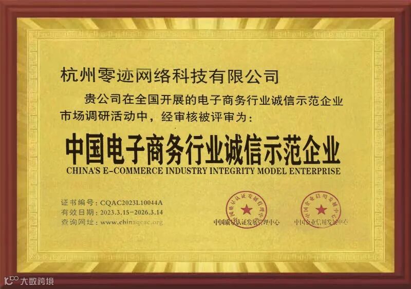 在2023年3·15全国集中开展消费者诚信活动中,由中国质量认证发展管理中心,中国企业信用发展中心联合评选审核,被评为“中国电子商务行业诚信示范企业”,公司旗下平台零迹全球购被荣选为:全国消费者放心购物平台,并给予重点宣传和推广。