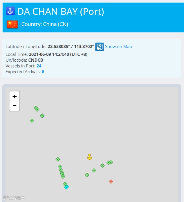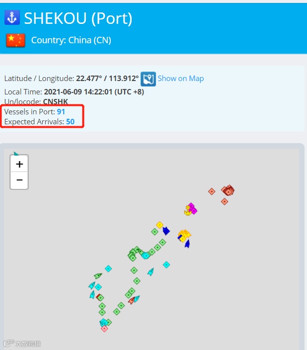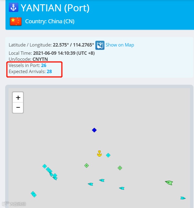 截止6月9日14时,有26艘船到达盐田,还有28艘船即将到达。