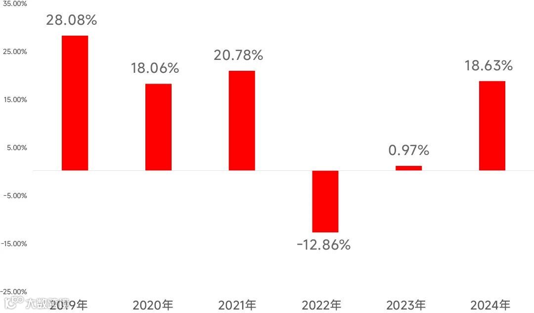 且在2019-2024年的6年里,该指数年度正收益的次数达到5次。
