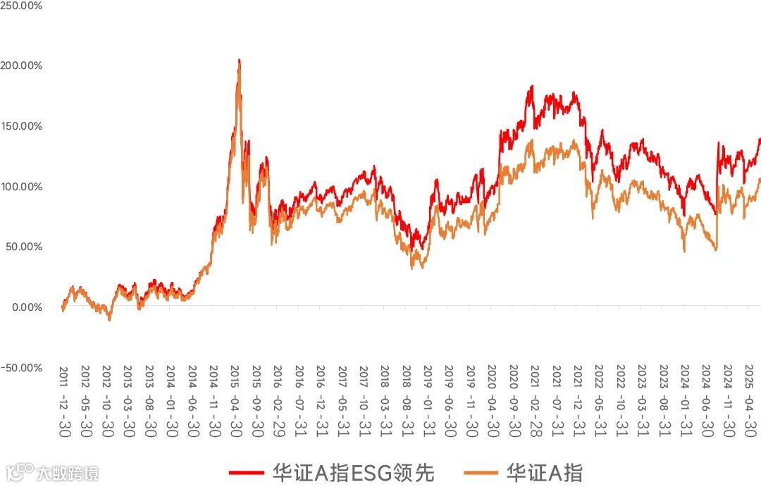 Wind数据显示,2011年12月30日至2025年7月31日,华证A指ESG领先指数涨幅(+134%)相较华证A指涨幅(+102%)的累计超额收益约为30个百分点。