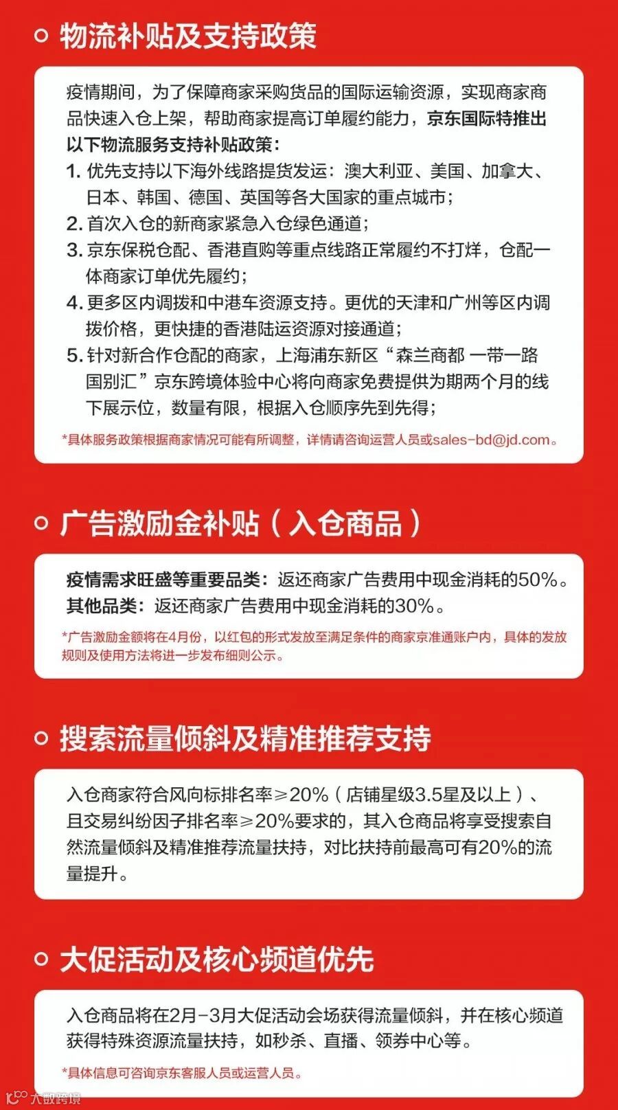 2月11日,亿欧获悉,京东国际宣布,2020年2月11日-2020年3月31日期间,将为京东跨境物流仓配一体服务的商家(SOP入仓商家)提供物流补贴及支持、广告激励金补贴、搜索流量倾斜及精准推荐支持、大促活动及核心频道优先共四项政策激励。