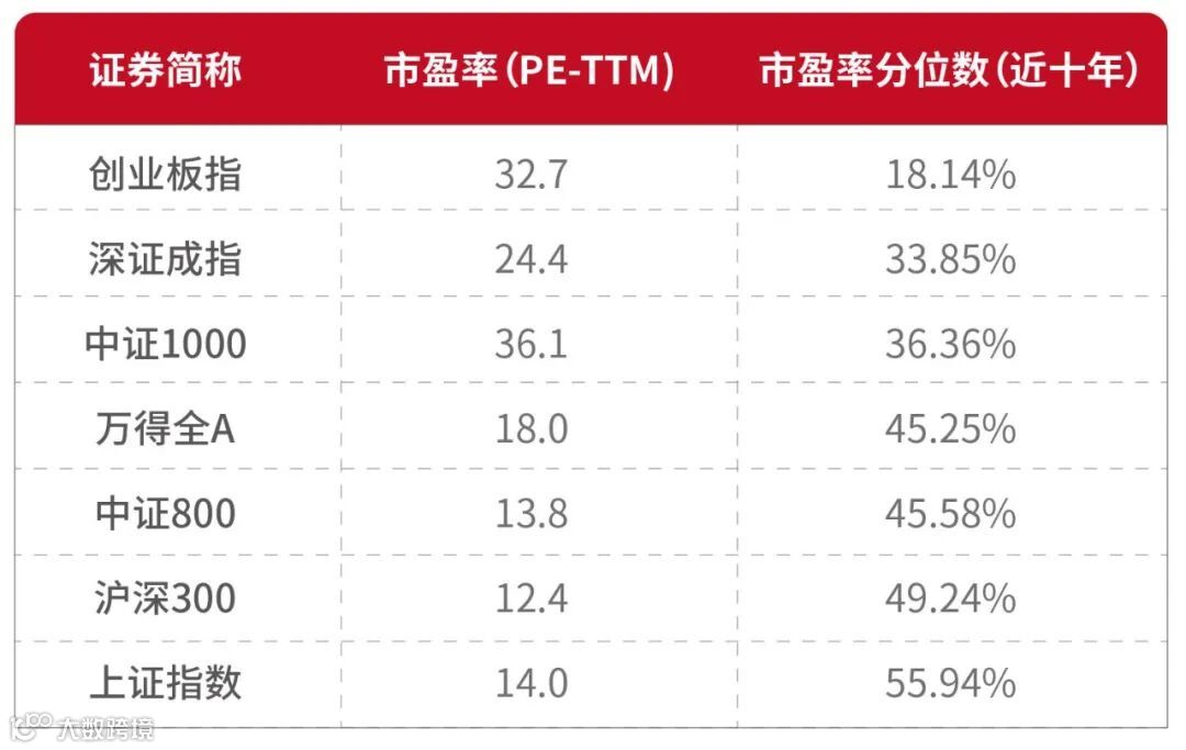 其中,创业板指市盈率(PE-TTM,下同)约为32.7倍,位于近十年来由低到高的18%分位数,处于较明显的低估状态;上证指数、万得全A、沪深300等市盈率也基本处于近十年来50%分位数,估值并不“贵”。