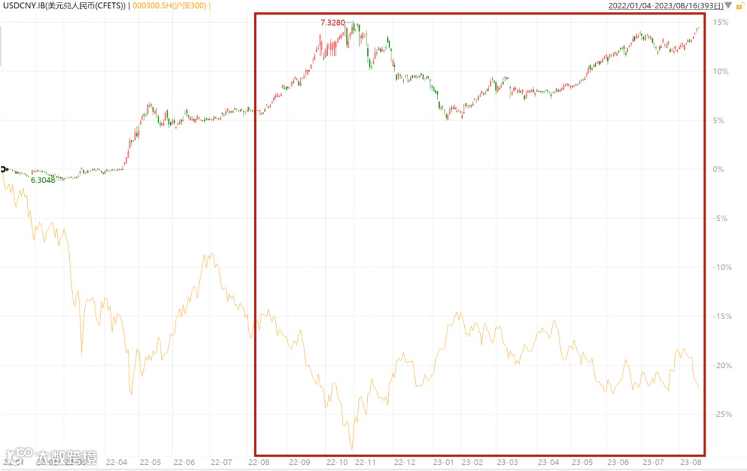 从过去一年多的走势来看,美元兑人民币汇率和沪深300指数几乎是一个镜像——