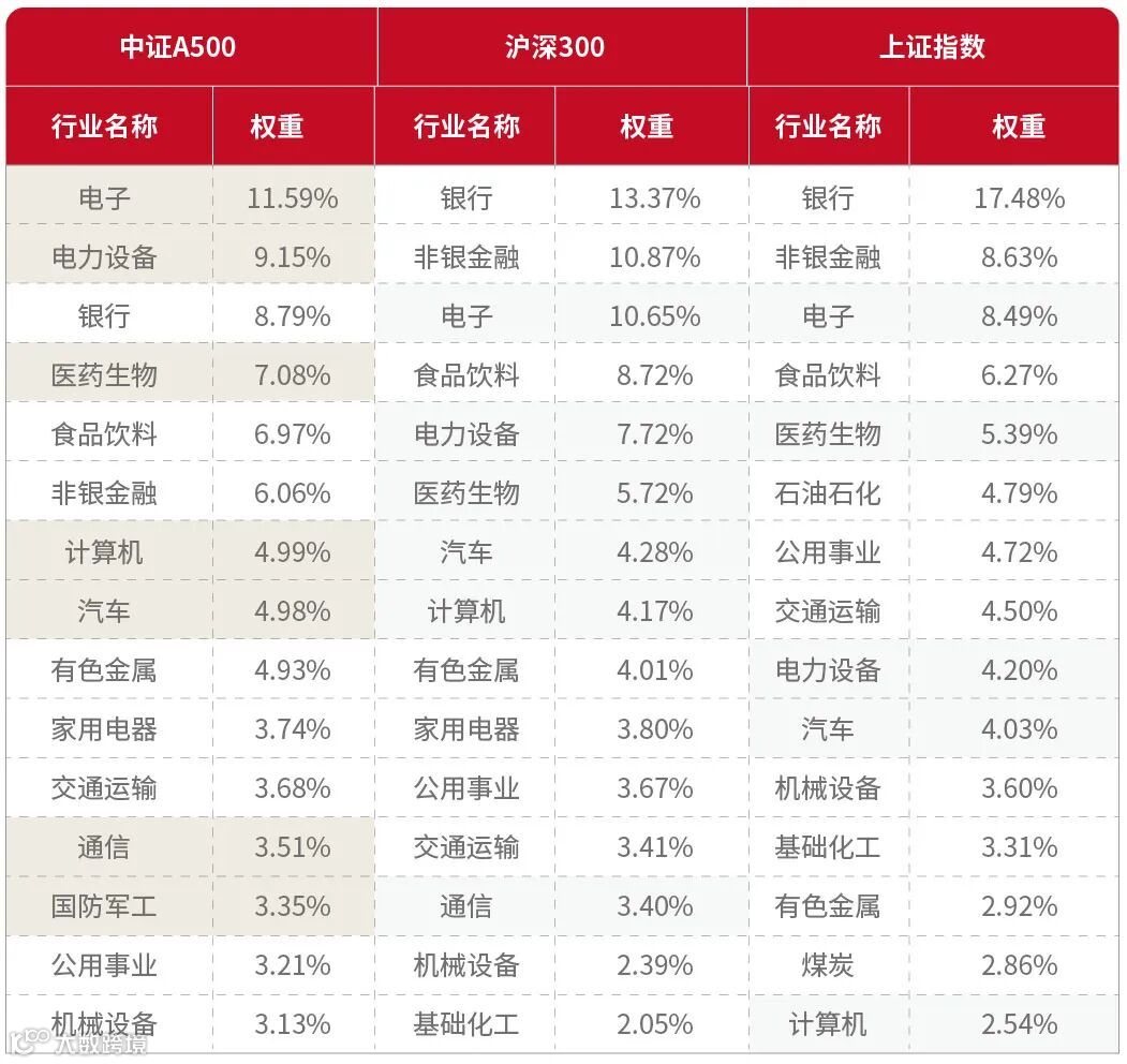 而且相比沪深300指数,中证A500指数成分股龙头更多,兼具了行业均衡性与市值代表性,被很多投资者看作“新一代核心标杆宽基指数”。