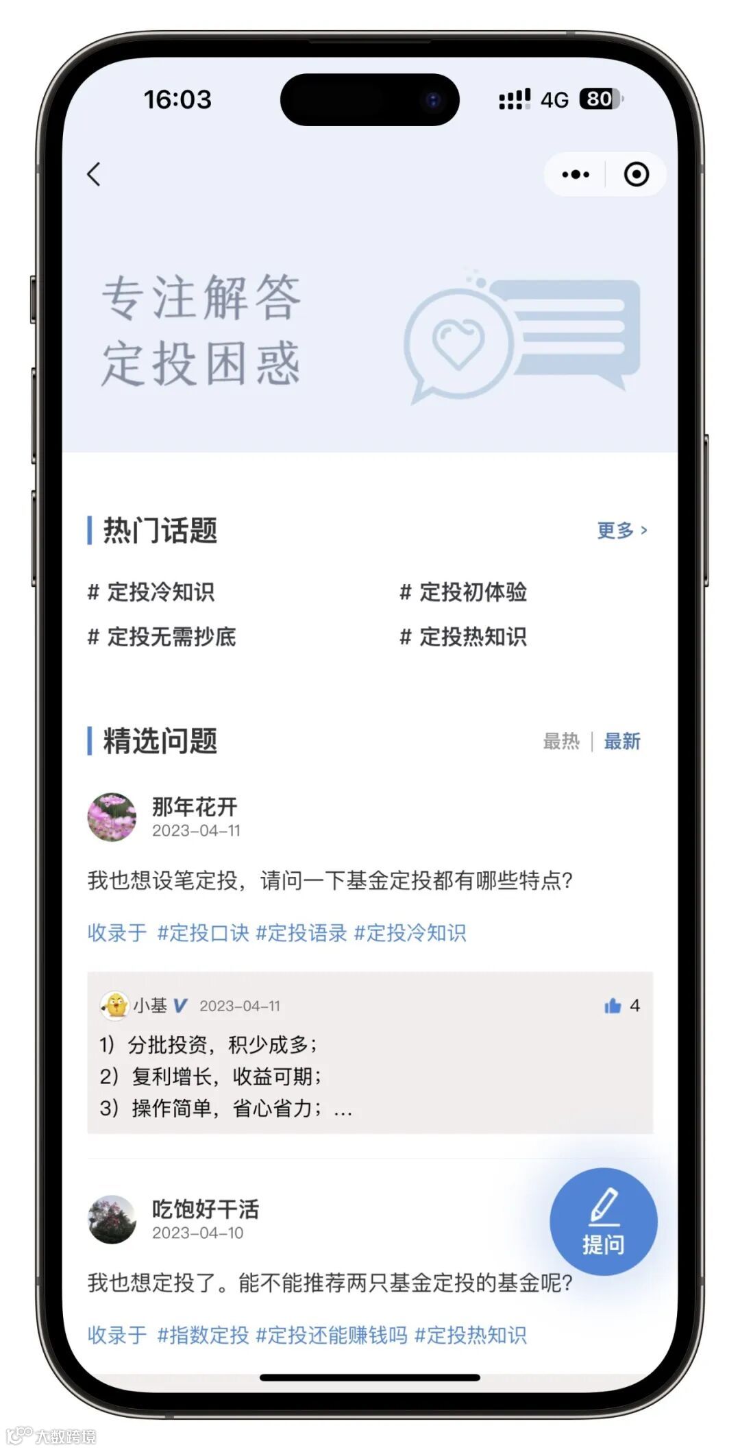 你还能在「你问我答」栏目,看到其他小伙伴关注的定投话题,学习、分享定投知识,提升定投技能。