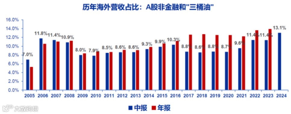 今年来海外需求保持高景气,并推动A股企业出海进程加快。根据Wind数据,2024年中报披露口径下A股海外营收占比提升至13.1%,是2005年历史以来中报口径的新高。(数据来源:Wind,截至2024.6.30)