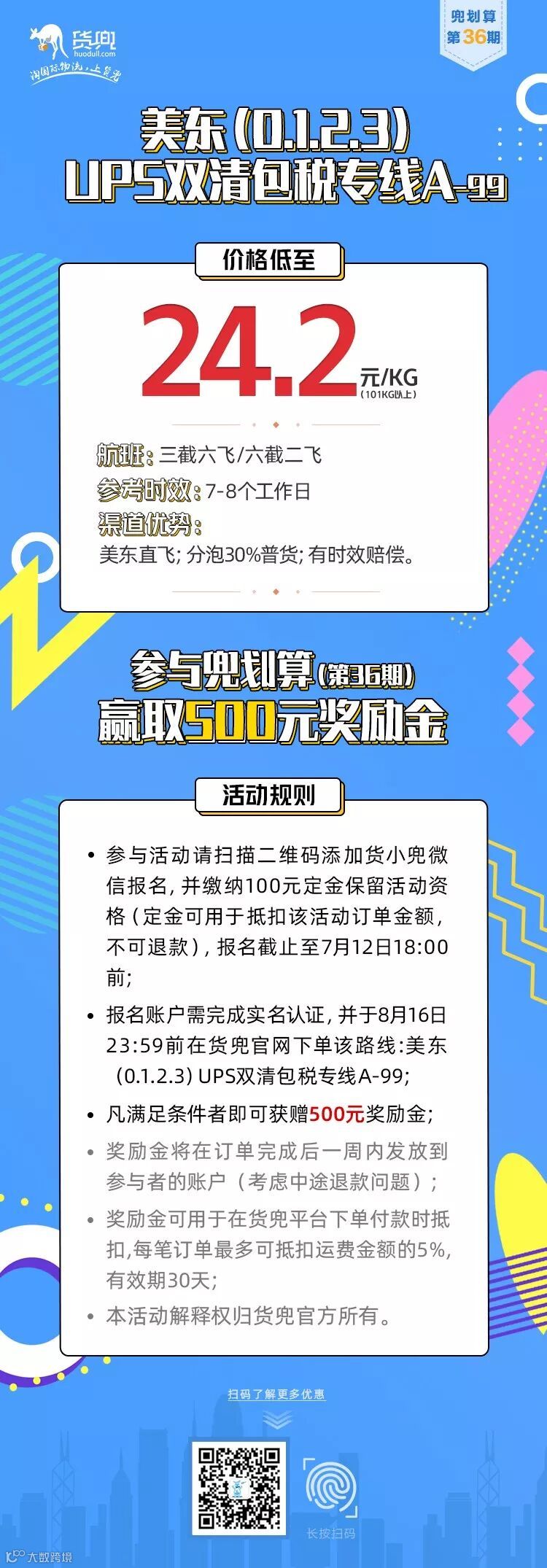 报名账户需完成实名认证,并于8月16日23:59前在货兜官网下单该路线:美东(0.1.2.3)UPS双清包税专线A-99;