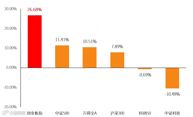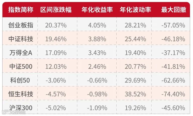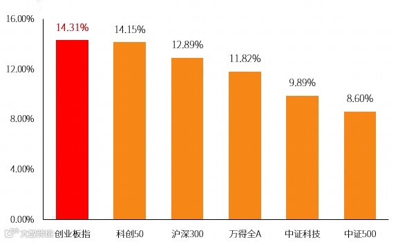 近几年业绩看,截至今年10月31日,创业板指自2020年以来上涨+20.37%,年化收益率约为+4.05%,大幅优于同期沪深300、中证500、万得全A等A股主流宽基指数,以及同期科创50、中证科技、恒生科技等主流科创类指数。