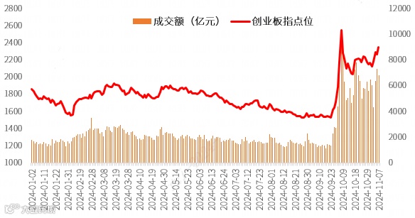Wind数据显示,截至11月11日,“924”以来创业板指已涨56.32%,在A股一众宽基指数中尤为显眼。