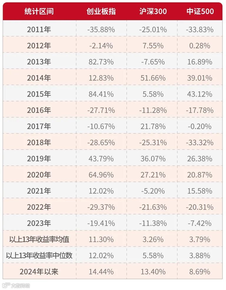 分年度看,创业板指自2010年6月发布以来,2011年-2023年13个完整自然年度的收益率均值为11.30%,明显优于同期沪深300(3.26%)、中证500(3.79%)。