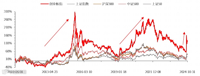 回顾历史可见,创业板指自发布以来(20100601-20241031),在过往牛市或反弹行情中,往往能展现出较强的上涨弹性,进攻犀利。