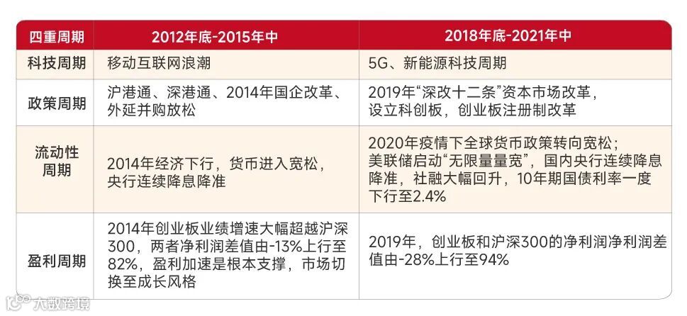 从投资周期看,复盘创业板的前两轮大牛市(2012底-2015年中、2018年底-2021年中),有其共同的特征,都是四重周期叠加下驱动的牛市,包括:科技周期、政策周期、流动性周期、盈利周期。